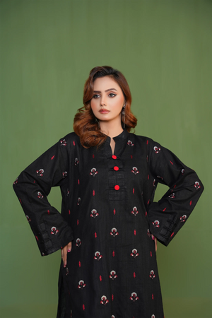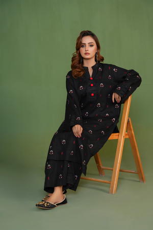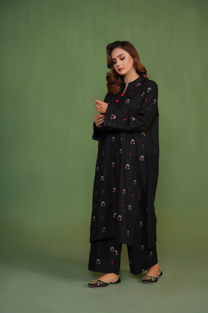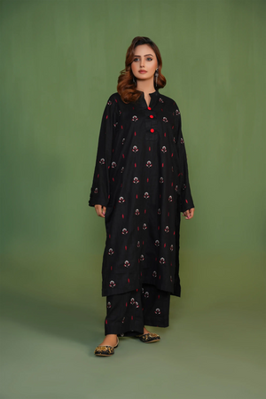 A Relaxed fit Embroidered khaddar dress with ban collar, featuring Embroidery all over on shirt and trouser, Buttons on top and ring cut on sleeves.