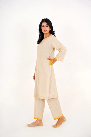 To further enhance the dress's charm, the trouser hem is adorned with embroidery border, creating an attention-grabbing detail that complements the overall design.